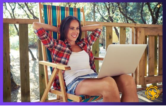 A smiling woman relaxes in a striped deck chair, staring at a laptop screen.